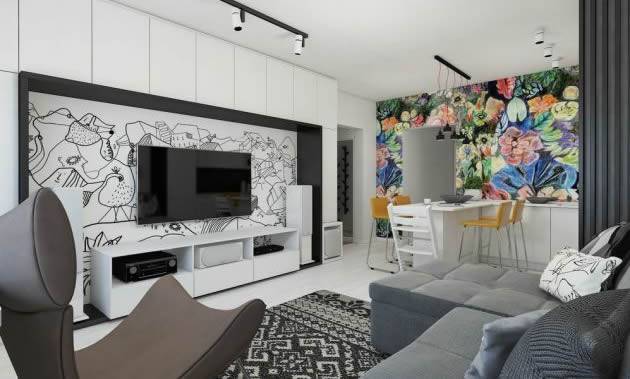 Она што овој стан го прави сосема поразличен од сите други е начинот на кој е постигната совршена симбиоза меѓу смирените бели тонови на ѕидовите и подот и силните нијанси на декоративните елементи.