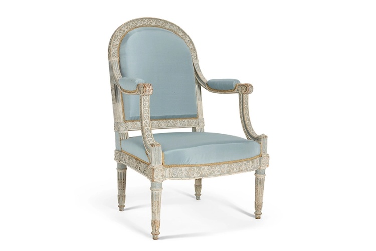Уште едно парче беше направено за кралицата речиси 20 години подоцна. Пастелно сината фотелја е дел од комплетот дизајниран од парискиот производител Жорж Јакоб. За жал, кралицата можела да ужива во своите станови во Версај само неколку години пред да биде испратена на гилотина во 1793 година.