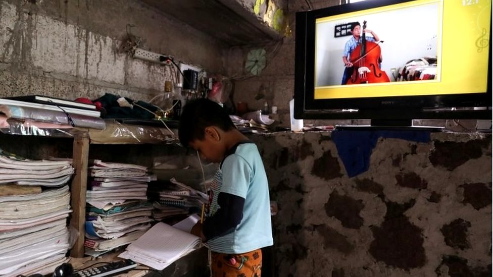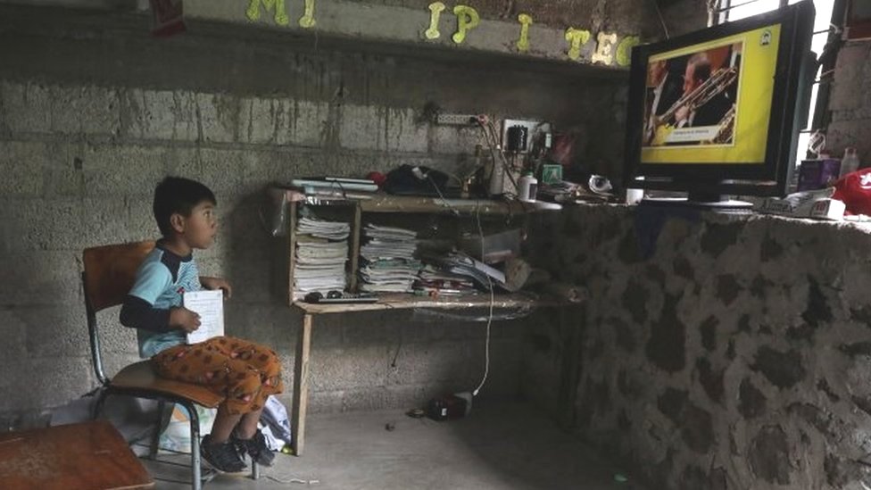 Пет годишниот Оскар Хернандез е еден од милиони ученици кои ја следат наставата со помош на телевизор.
