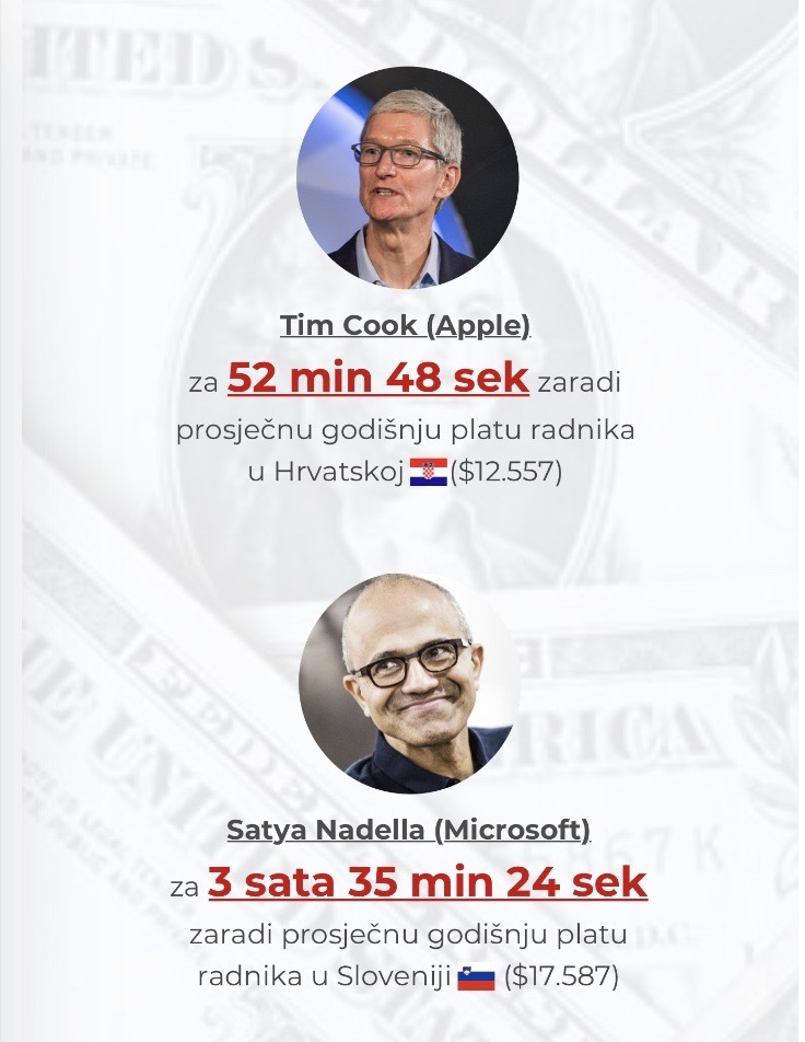 Така, тие се дојде до информации дека Џеф Безос заработува просечната годишна плата во Босна и Херцеговина ($ 6.726) за помалку од три секунди. Марк Цукерберг ја заработува просечната годишна плата на еден работник во Црна Гора за една минута и 48 секунди.