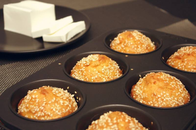 - Наполнете ги формите за мафини со добиената смеса и поросете со сусам.