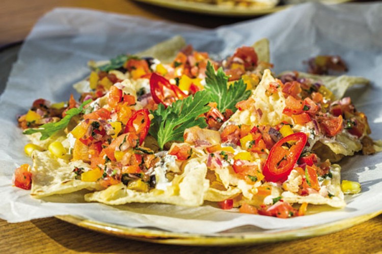 Испржете го пилешко и исечете ги на коцки. Посипете со сок од лимон и оставете да се излади. Исцедете го сокот од конзервите и измешајте со сецкани краставици и пиперки. Соберете ги сите состојки, додадете сол и посипете со малку шафран. Ставете го чипсот во соодветен сад и истурете ја смесата одозгора. Добар апетит!