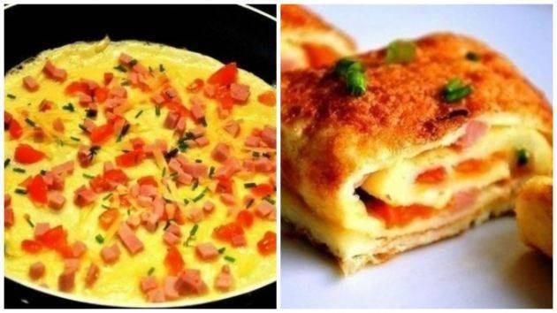 3. Истурете околу 2/3 од смесата во подмачкана тава на оган и додатете ги одозгора сечканата шунка, доматите и ренданиот кашкавал. Превртете кон средината мал дел од едната страна на омлетот а во празното место истурете ја преостанатата смеса
