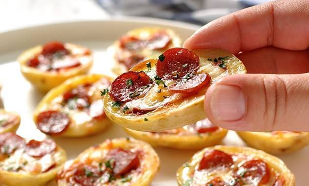 Печените компири можете да ги направите на еден малку невообичаен начин – од нив направете мини пици. Ова предјадење е одлично за забавите со пријателите.