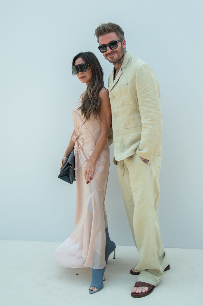 Поранешната спајсица носеше бледо розев асиметричен фустан и големи очила за сонце, додека спортистот носеше ленени панталони во беж боја, блејзер и атлетска маица. И како и многу мажи ова лето, Дејвид класичните чевли ги замени со сандали, додека Викторија, сосема спротивно, носеше долги чизми.