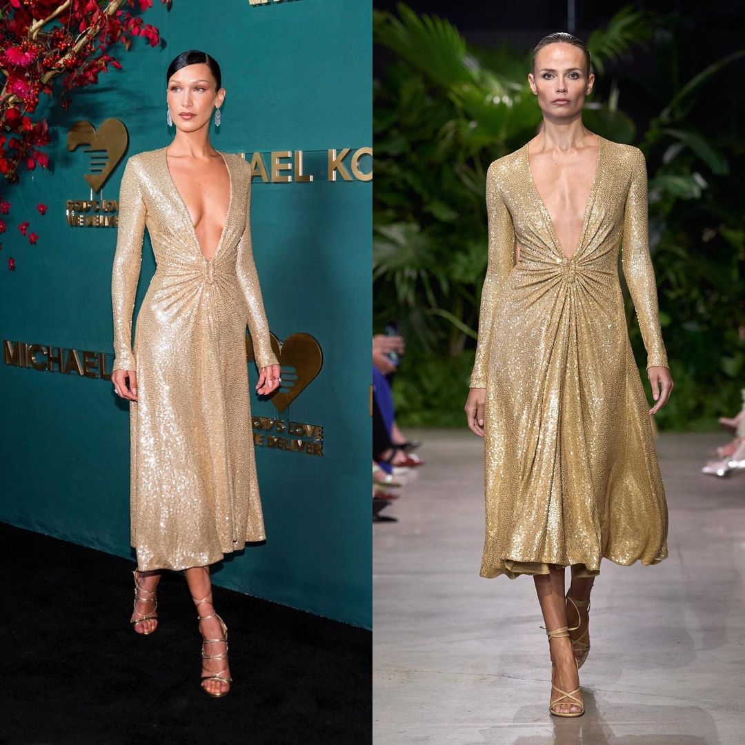 Изданието кoe комбинира ретро гламур и современ дизајн,Хадид го комплетираше со златни сандали со врвки со висока потпетица.