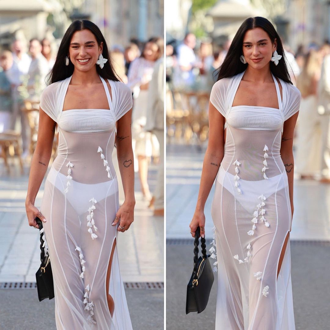 Атрактивната поп-ѕвезда избра долг бел фустан од проѕирен материјал со висок шлиц од страна и гол грб, а оваа бајковита и секси креација ја претстави Simon Portre Jacquemus на ревија во француската солена куќа на крајот на јуни.