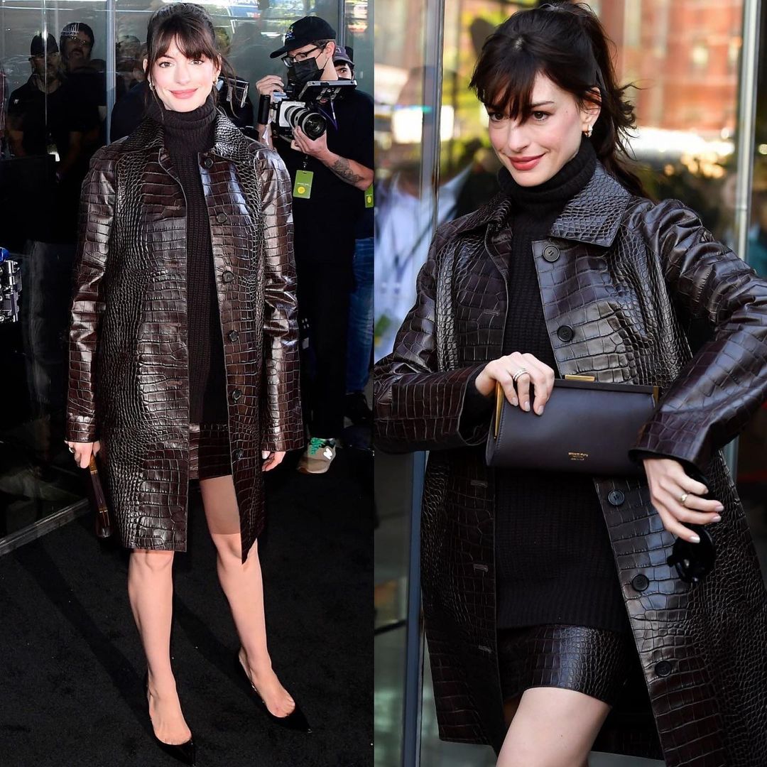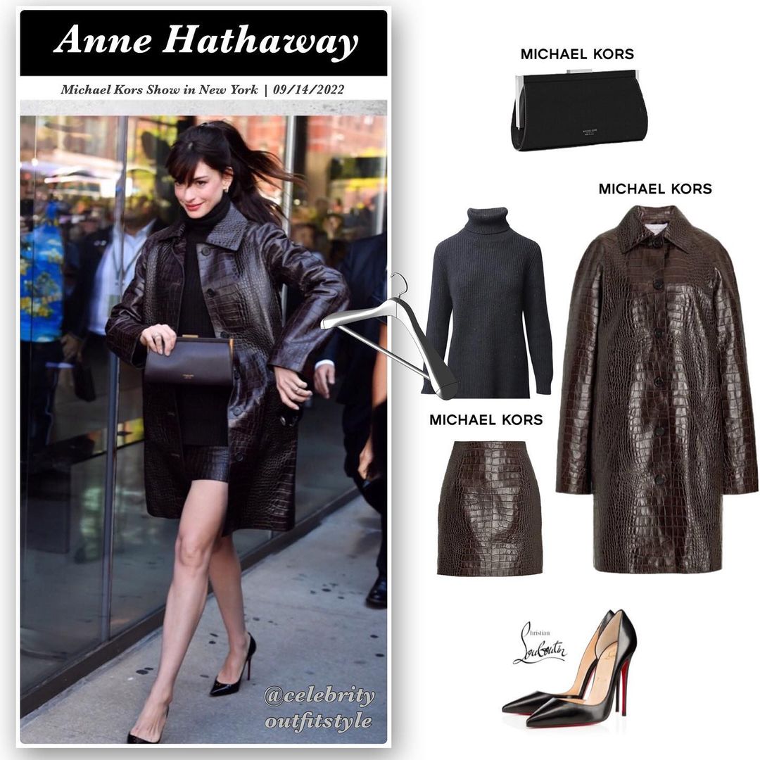 Целиот стајлинг, вклучувајќи го коженото здолниште и соодветниот мантил, како и црниот горен дел и чантата, го потпишува брендот Michael Kors, чија ревија се одржа во Големото јаболко.