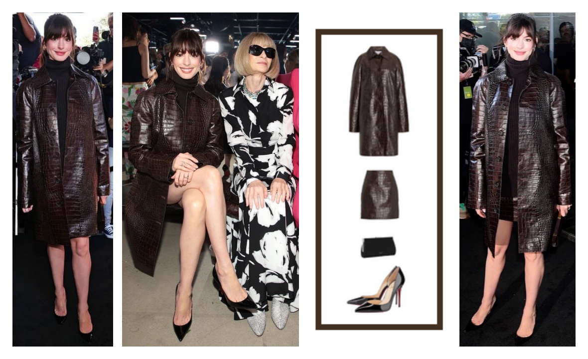 Целиот стајлинг, вклучувајќи го коженото здолниште и соодветниот мантил, како и црниот горен дел и чантата, го потпишува брендот Michael Kors, чија ревија се одржа во Големото јаболко.