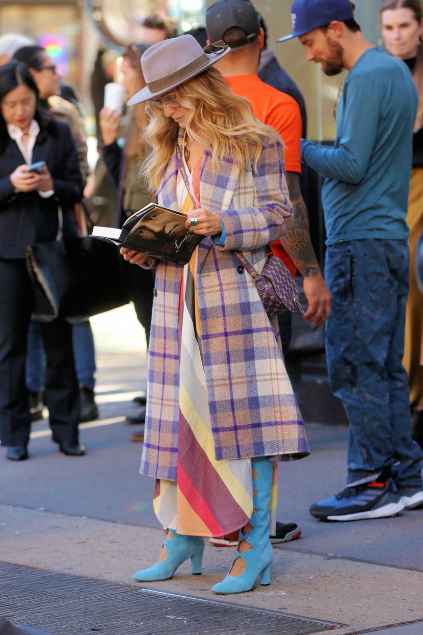 Актерката за вчерашното снимање носеше идеална есенска комбинација која многу жени ширум светот ќе ја посакаат за себе. Имено, таа облече лелеава шарена тоалета над која носеше карирано тробојно палто.