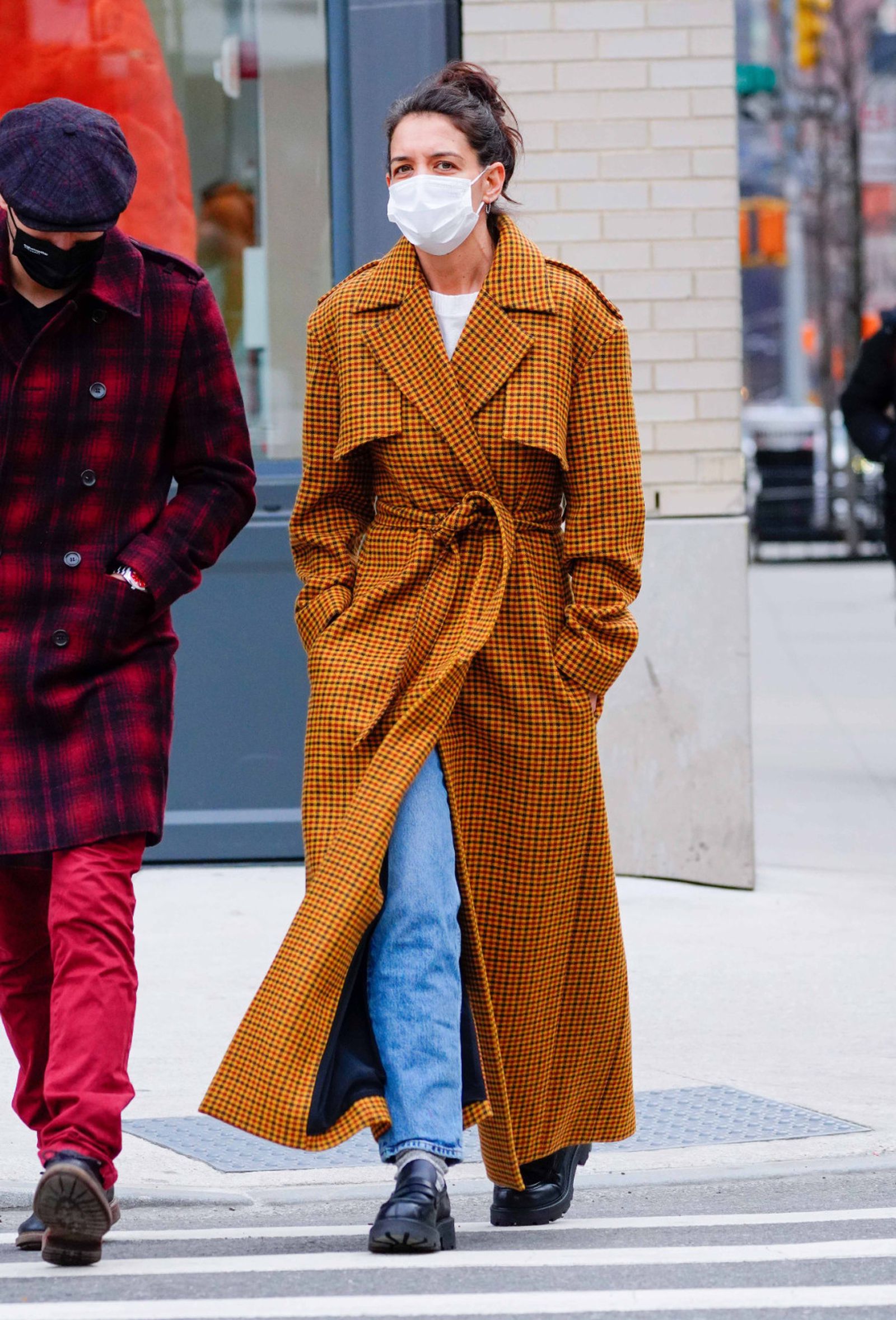 Кети Холмс ги спои со големи фармерки, едноставна памучна маица и привлечно жолто карирано мантилче.