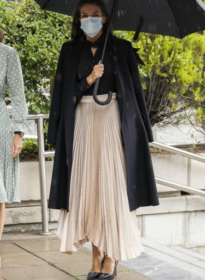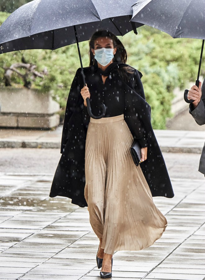 Се согласуваме дека практичната, топла и пријатна облека е приоритет на есен, но понекогаш вреди да се прават исклучоци. И шпанската кралица е одличен пример за инспирација. И покрај дождот и лошите временски услови, сопругата на Фелип VI не го менува стилот, избирајќи елегантна облека и женствена силуета.