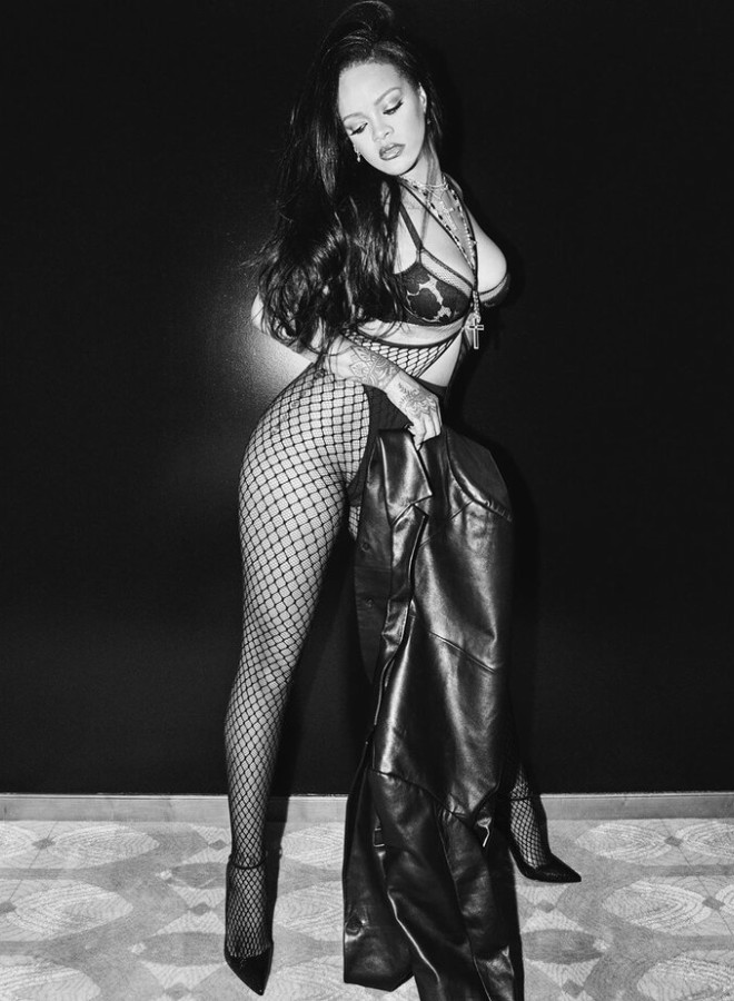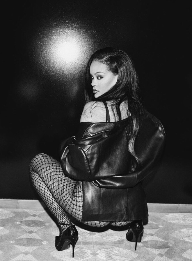Самата пејачка и дизајнер учествуваше во модната ревија на нејзиниот бренд. Ријана ги сподели своите секси фотографии од зад сцената на својот Инстаграм. На црно-бели слики, таа позира во мрежни чорапи, долна облека и црни потпетици. Веќе смелиот и пркосен стил е надополнет со најмодерната работа во сезоната – кожна јакна, како и ланци околу вратот со големи крстови во форма на приврзоци.