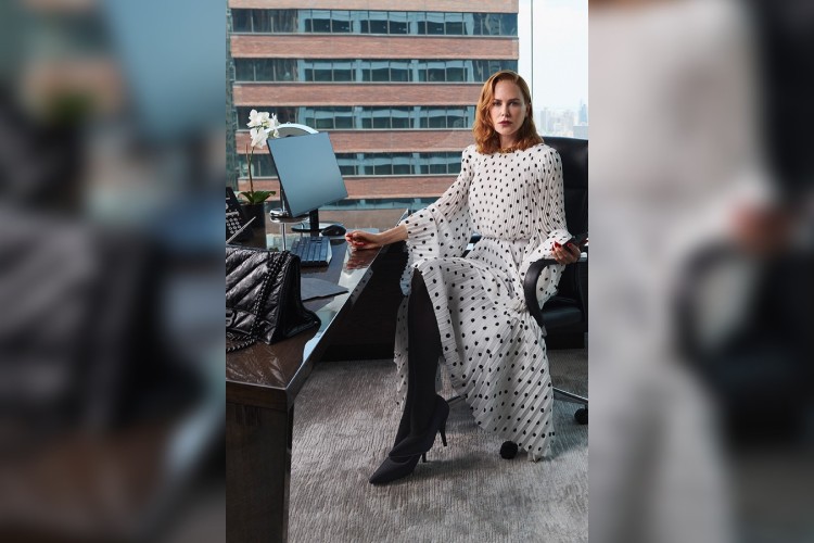 На една фотографија Никол Кидман носи црно кожено палто со ремен кој ја истакнува нејзината половина, заедно со црни чорапи и мокасини.