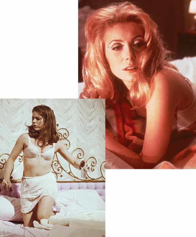 Кетрин Денев исто така се појави неколку пати пред камерата во долна облека. Во градникот ја гледаме актерката во филмот „Belle de Jou“ (1967). Младата девојка Северина (Кетрин Денев) е несреќна во бракот, бидејќи нејзиниот грижлив сопруг не може да ги задоволи нејзините мазохистички аспирации.