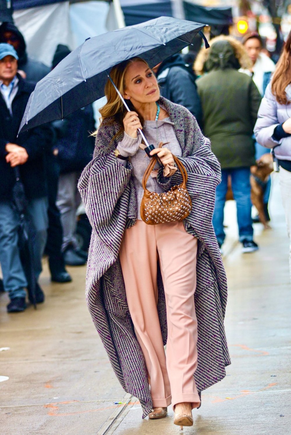 Така Сара Џесика Паркер беше забележана во прекрасни панталони во нежно розова нијанса, а ги комплетираше со ефектен капут/наметка, сив џемпер и беж шилки.