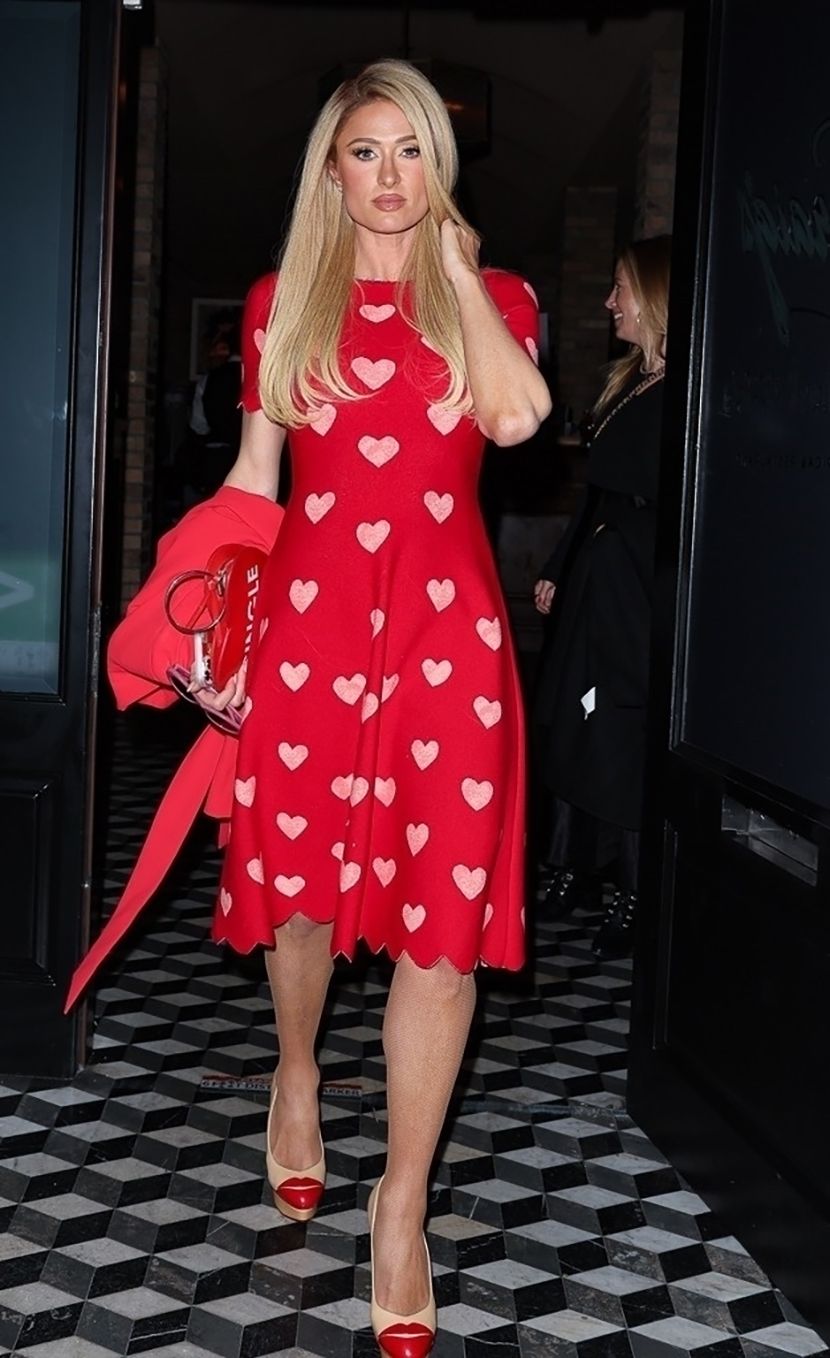 Дека црвената е бојата на љубовта и е добро познато на Парис, која комбинираше фустан со срциња со потпетици на кои имаше принт од усни на прстите.Во раката, Парис носеше црвен блејзер, а на лицето во еден момент стави очила за сонце со розова рамка.