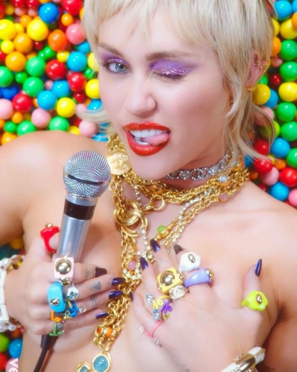 Но, таа не е единствената што ужива во овој детски моден детал – нејзината колешка Мајли Сајрус, со која го сними хитот „Prisoner“, со ретро „фудбалска“ фризура, често носи пластичен накит.