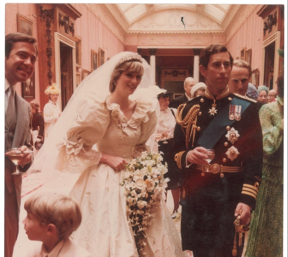 Кога се омажи за престолонаследникот Чарлс на 29 јули 1981 година, Дијана блескаше во спектакуларна и една од најпознатите венчаници во историјата што следеше по дизајнирањето на модата во 80-тите. Венчаницата од бајките со издувани ракави и детали од тантела, изработена од свилена тафта, ја дизајнираа Дејвид и Елизабет Емануел, млад пар избран да ја поддржува британската модна индустрија. Во венчаницата беа зашиени над 10.000 бисери, кои наводно чинеле 776.000 куни. Можеби највпечатливиот дел од стајлингот беше превезот долг седум и пол метри, кој влезе во историјата како најдолг превез што се носеше на која било кралска свадба.