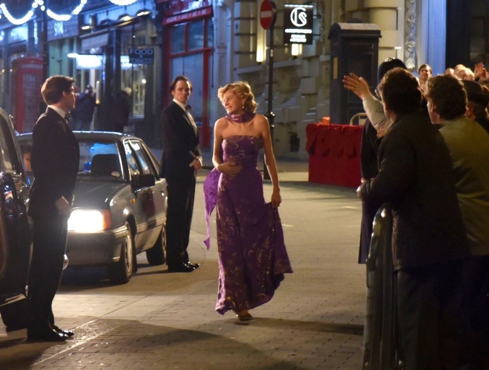 „Ја снимивме сцената кога за прв пат ја видовте во венчаница – мислам дека тоа беше Ланкастер Хаус во Лондон – и имав тим од околу 10 луѓе кои ми помогнаа да ја облечам затоа што е голема и тешка. Кога излегов пред нив во фустан, сите занеме. Фустанот е тотално принцеза Дијана во целосна смисла на зборот “, рече таа.