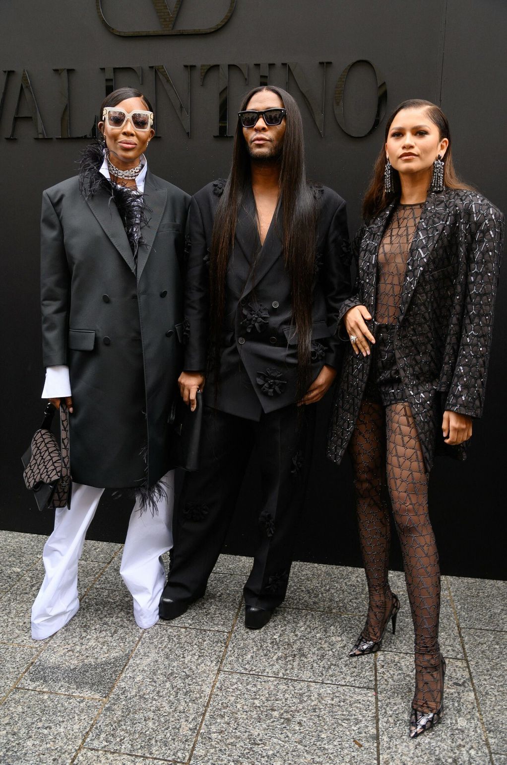 Младата Зендаја, која веќе има статус на стилска икона, на ревијата пристигна во проѕирно кристализирано боди под кое се гледаа црни шорцеви. Зендаја носеше и предимензионирана црна светкава јакна, која како и остатокот од аутфитот беше украсена со препознатливото лого на модната куќа Valentino.