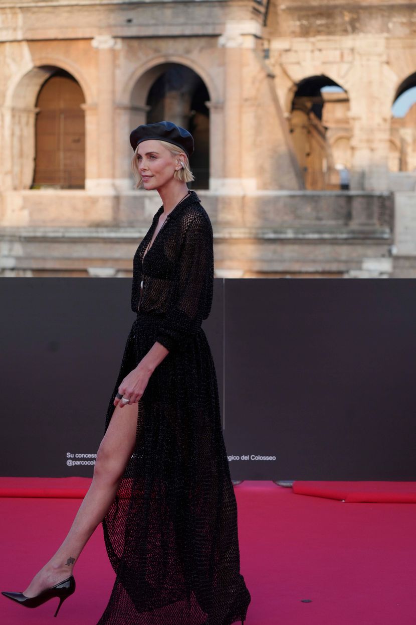 47-годишната Шарлиз се појави на црвениот тепих во Рим изгледајќи како античка божица. На себе имала црн долг проѕирен фустан под кој се гледал градник од истиот материјал.