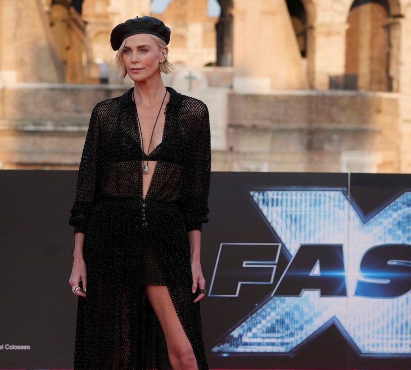 47-годишната Шарлиз се појави на црвениот тепих во Рим изгледајќи како античка божица. На себе имала црн долг проѕирен фустан под кој се гледал градник од истиот материјал.