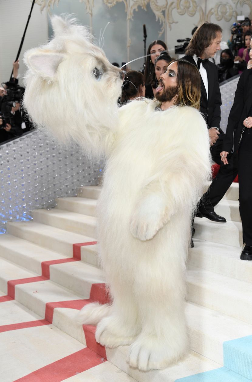 Џаред Лето облече џиновски костим на мачката на модната икона Карл Лагерфелд на Мет Гала 2023 …