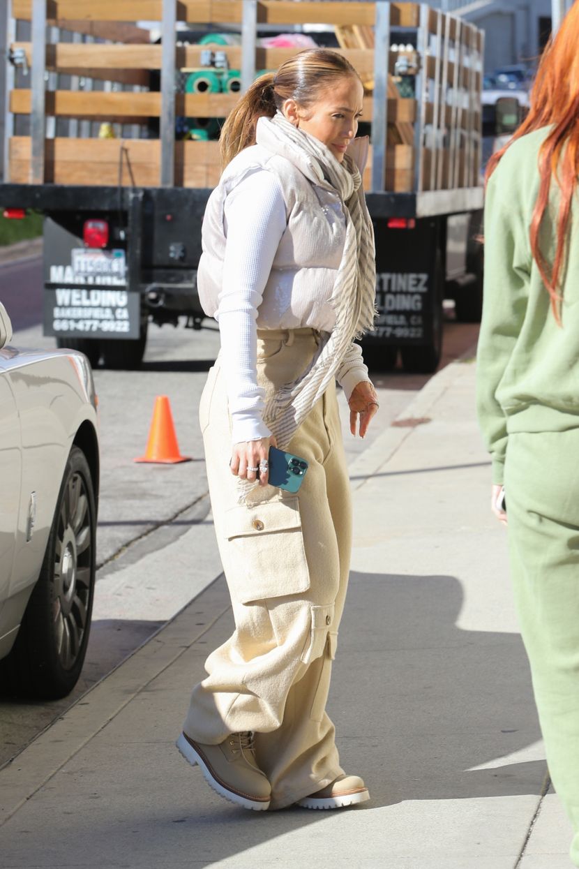 Широки беж панталони со џебови, канаѓанки, бел дуксер и краток светол елек беа модните избори на Џенифер Лопез.