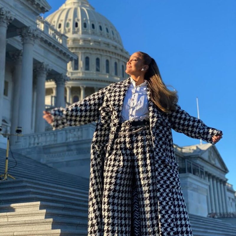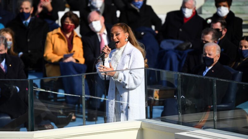 По продорниот перформанс на Лејди Гага, Камала положи заклетва, а потоа збор даде Џенифер Лопез. Ѕвездата се потпре на белиот тотален изглед за да ја потенцира свеченоста на моментот што дефинитивно ќе замине во историјата. Џеј Ло избра долг мантил што го носеше над проѕирна блуза, додека панталоните со бисери и дијаманти беа последниот допир на изгледот. Дури и во случај на инаугурација, нашата хероина не можеше да се откаже од својата љубов кон сјајот, сепак, мора да и оддадеме почит, сите модни додатоци изгледаа многу хармонично и одговараа на приликата. Пејачката ја собра косата во лаконска опашка, а накитот направен од бисери и дијаманти блескаше на сонцето.