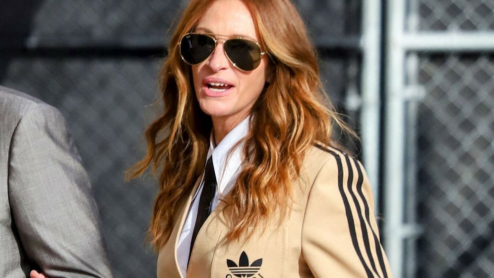 Сакото е украсено со логото на спортскиот бренд Adidas и луксузната италијанска модна куќа Gucci и ги има трите пруги на ракавите, заштитен знак на Adidas. Краевите на ракавите се украсени со ефективен додаток од крзно. Под сакото со двојни копчиња, Џулија носеше бела кошула и тенка црна вратоврска.Панталоните се исто така комбинација на елеганција и спортски стил, со пошироки ногавици и засилен раб и со три вертикални линии на страна.Со вака ефективно одело, наједноставните чевли одат најдобро, а Јулија се одлучи за лакирани црни мокасини, модел на чевли кој е синоним за женственост и префинетост. Џулија Робертс го комплетираше својот стајлинг за гостување во шоуто на Џими Кимел со авијатичарски очила за сонце и црн лак.