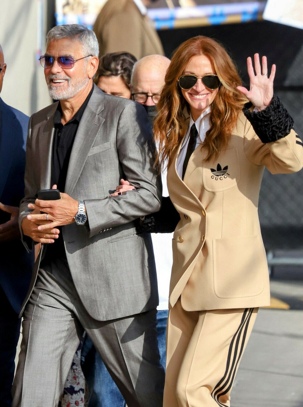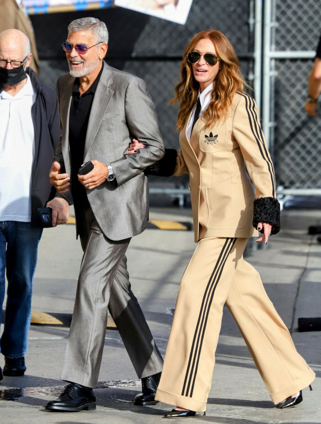 Џулија Робертс и Џорџ Клуни во емисијата Jimmy Kimmel Live го промовираа филмот „Билет за Рајот“, романтична комедија за втора шанса за љубовта, а на снимањето во Холивуд дојдоа рака под рака и со широки насмевки. Актерскиот пар, кој дели одлично пријателство, беше стилски координиран, Клуни во светкаво сив костим со црна кошула одоздола, а Џулија исто така облечена во костум. Оскаровката изгледаше многу шик во беж костум на Gucci-Adidas,чиј дизајн е комбинација на гламур и спортски стил.