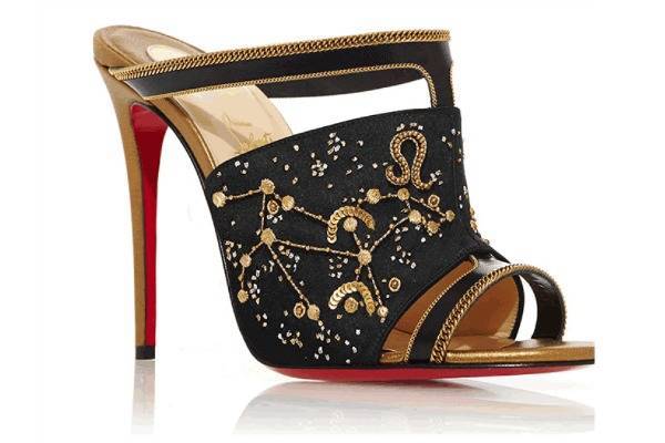 Инспириран од личениот интерес за хороскоп и астрологија, Lubutinovim ни нуди 45 модели во три нијанси на сатен: трула вишна, црна и сина, украсени со хороскопскзнаци кои се вткаени во сребро и злато.
