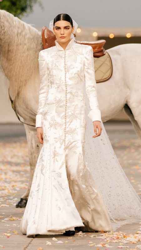 И, конечно, она за што сите се собраа: излезот на невестата која се појави пред гостите на бел коњ. Невестата изгледаше како да излегла од фотографијата од 1920-тите, со нејзиниот превез, долг сатенски фустан, Lesageom, извезена со пеперутки од скиров и бисер, крагна и манжетни. Облеката беше надополнета со многу импресивен превез што ја придружуваше девојчето по модната писта кога таа конечно се појави пред гостите собрани во салата.