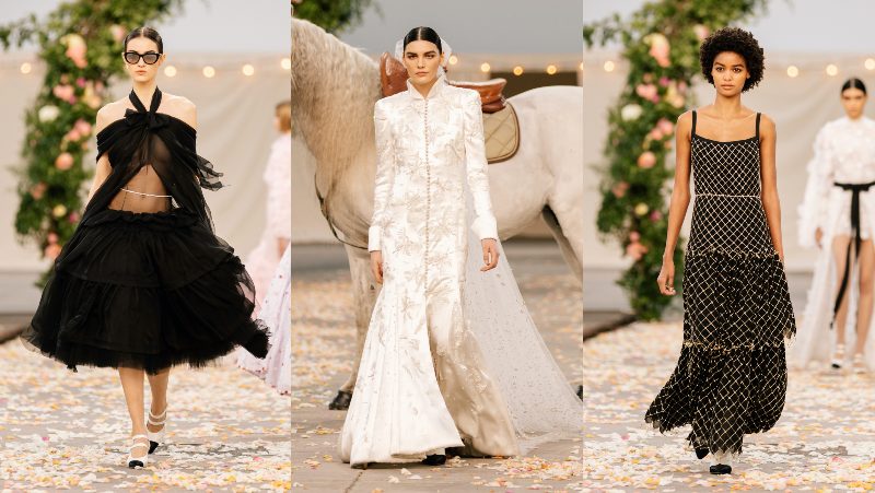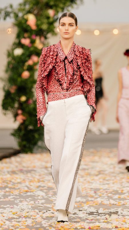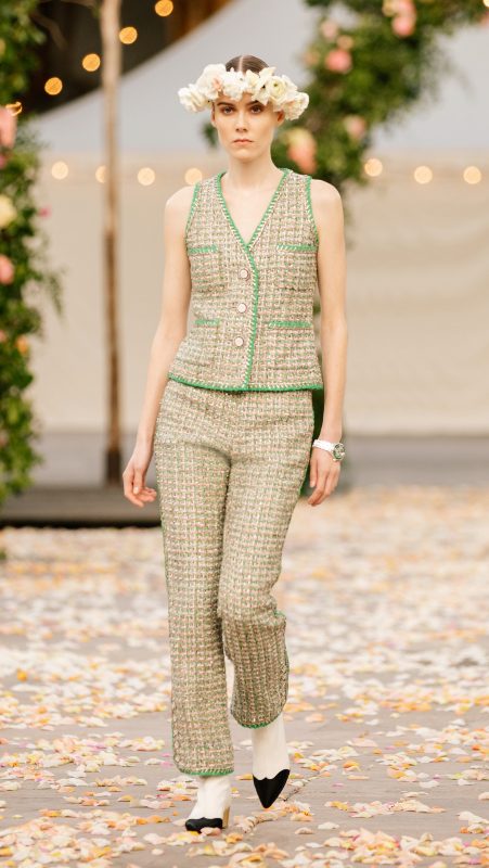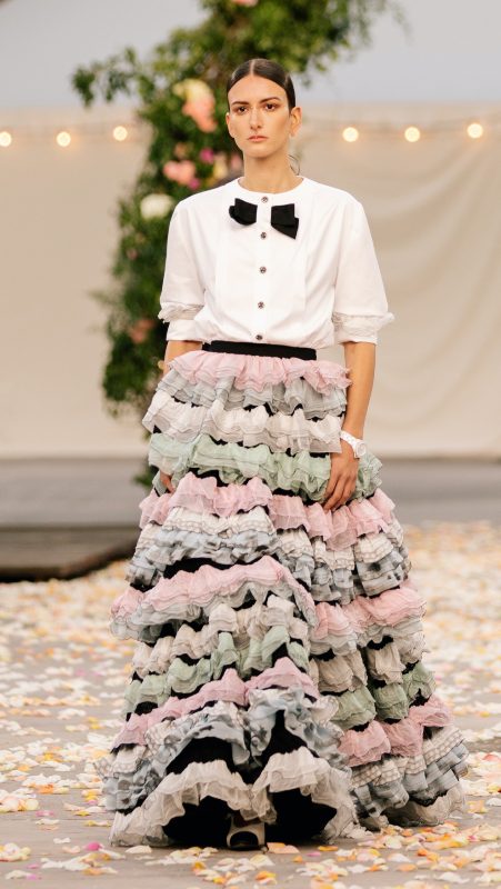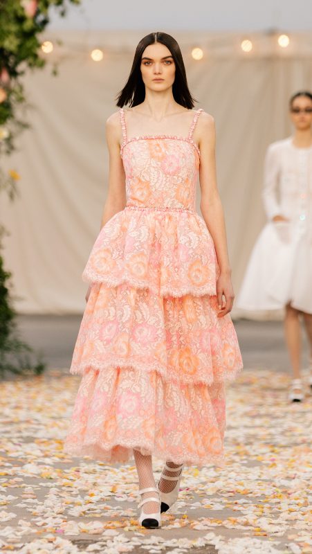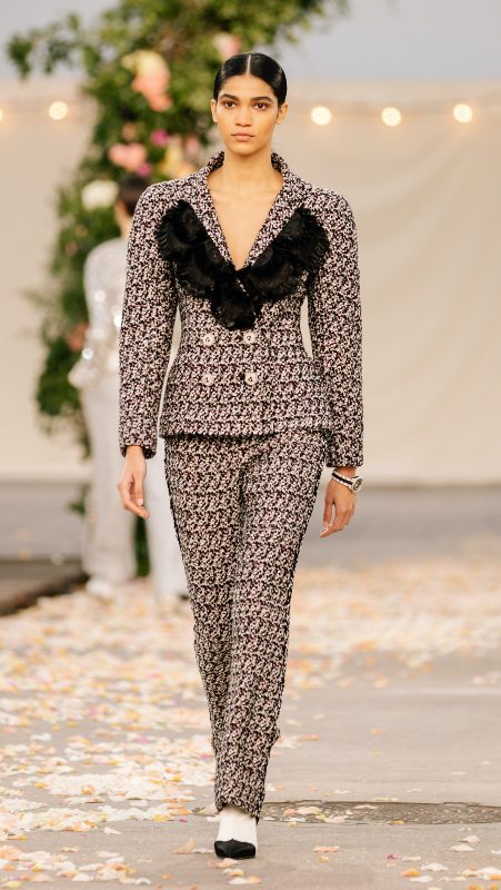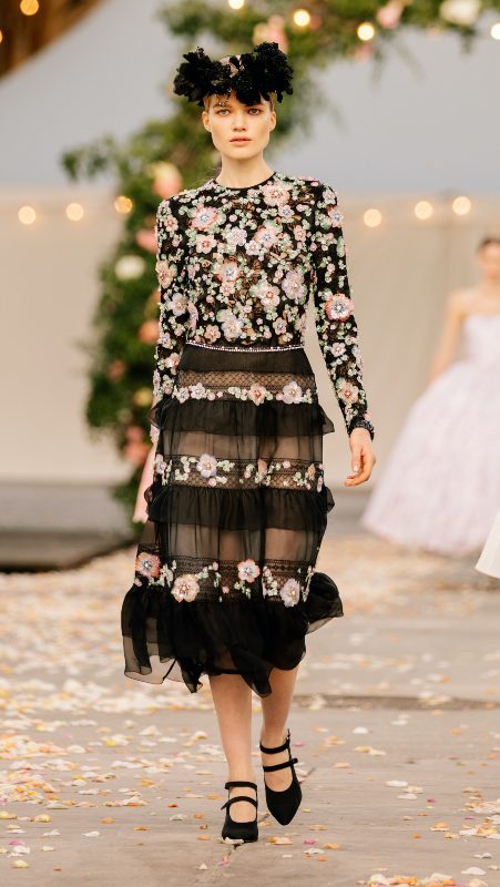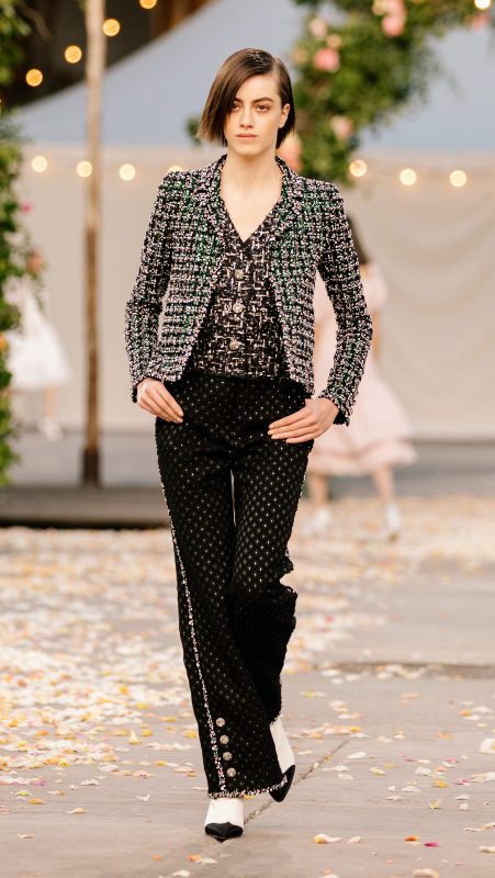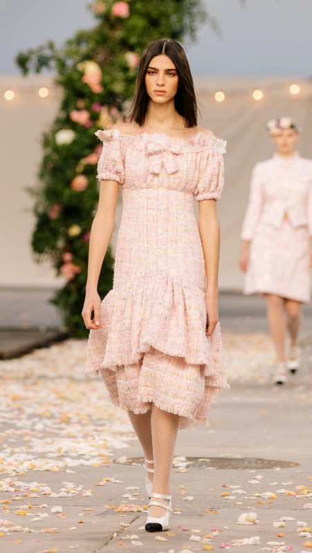 Ние сме навикнати на фактот дека модните ревии на Chanel секогаш ја надминуваат нашата најлуда фантазија. Огромната сала на Grand Palais, илјадници гости од целиот свет, неверојатни украси, вселенски бродови, санти мраз, Place Vendome во минијатура … Се чинеше дека нема што да не изненади. Но, Вирџини Виард го повтори тоа. Ревијата започна со општа прошетка на модели. Овој почеток веќе беше малку збунувачки. Постепено стана јасно: ова не е само модна ревија. Ова е вистинска свадбена церемонија, каде што моделите и гостите и, воопшто, се протагонистите. Беа подготвени и празни столови во невообичаено празната сала на Grand Palais (пандемијата спречуваше собирање гости од куќата од целиот свет). Постепено, сите девојки ги заземаа своите места меѓу славните амбасадори на Chanel, кои исто така се покажаа гости на оваа необична модна венчавка.