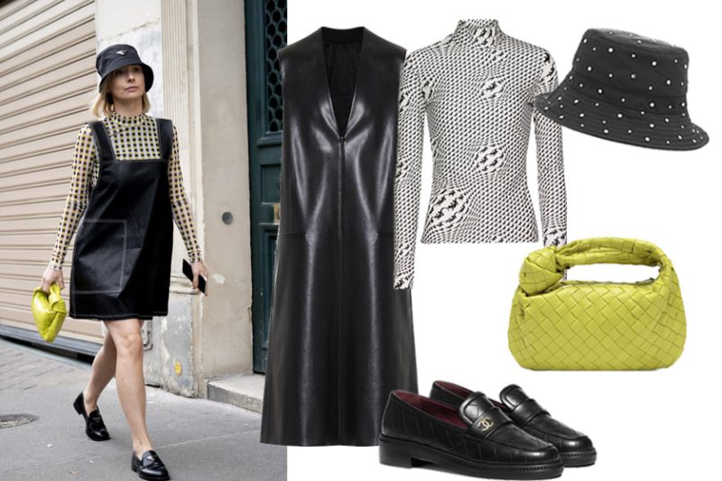За денешниот изглед, решивме да направиме preppy шик комбинација, комбинирајќи bucket капа со црн фустан од миди, блуза со долги ракави со принтови и прекрасни мокасини на Шанел. За да дадеме добар контраст на оваа црна облека, избравме торба Bottega Veneta во неон-зелена боја.