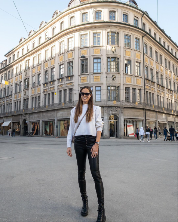 Имено, познатата дама на оваа социјална мрежа споделила фотографија од Минхен на која носела црни кожени панталони, лежерен бел џемпер, а целиот аутфит го заокружила со пар мартинки.