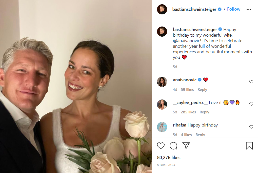 По тој повод, нејзиниот сопруг Бастијан Швајнштајгер ја сподели објавата на својот Инстаграм профил со нежна порака посветена на „неговата убава сопруга“.