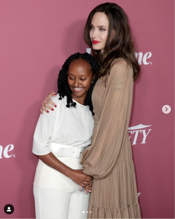 Таа се појави на гала вечерата во друштво на нејзината 16-годишна ќерка Захара, која ја придружуваше својата мајка во бела комбинација од глава до пети, додека Анџелина исто така се одлучи за монохроматска варијанта, но во интересен карамел тон.