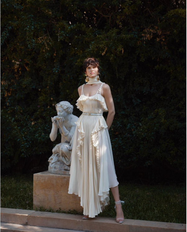 Фустан изработен од муслин и благ А крој, целосно затворен преден дел и долго здолниште – се истакнува со плисирани детали кои потсетуваа на мали набори, и ракави во форма на ѕвонче.