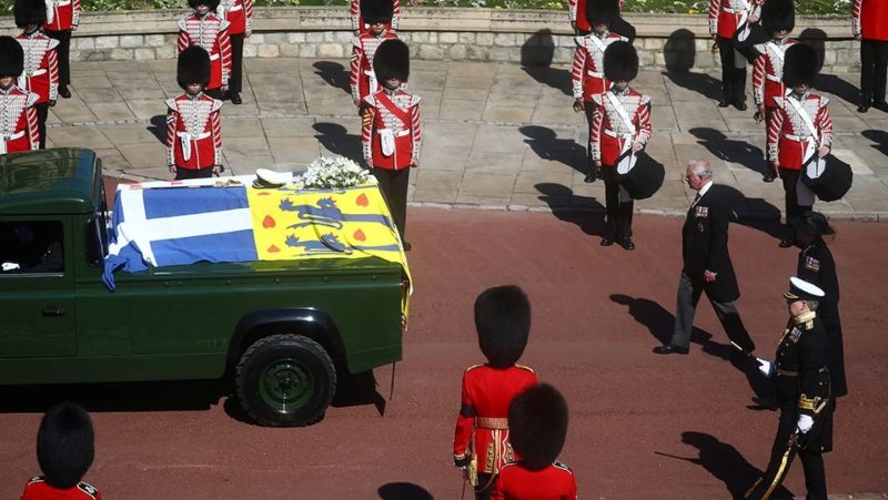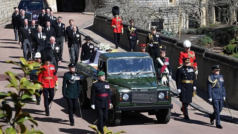Непосредно пред 3 часот, телото на принцот е качено на специјално дизајнираниот Land Rover, дизајниран со години од самиот војвода од Единбург. Веднаш зад возилото била тивката поворка од високи членови на британското кралско семејство, вклучувајќи ги принцот Чарлс, Вилијам и Хари. Кралицата Елизабета била последната, следејќи ја поворката.