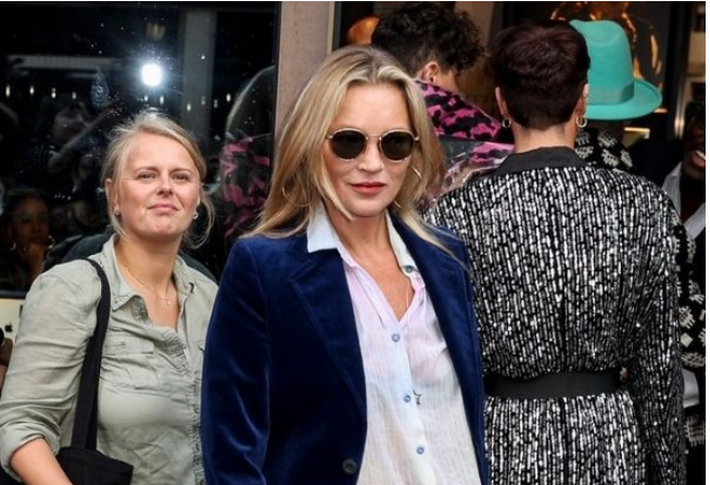 Поранешниот супермодел за оваа пригода отиде на сигурно лежерно издание. Под кадифено темносин блејзер, таа носеше проѕирна кошула, која ја комбинираше со фармерки и пар кафени кожени чизми – без кои ретко излегува од станот.