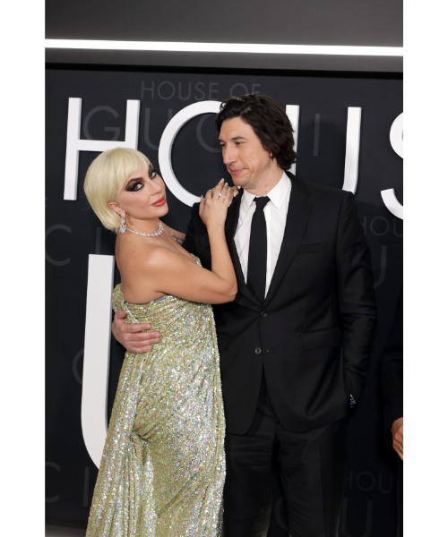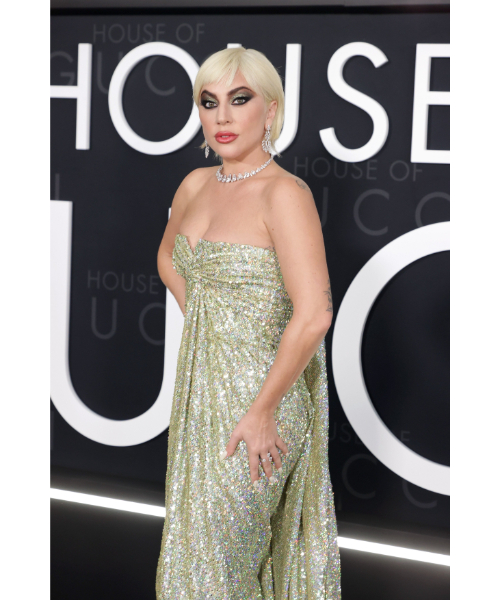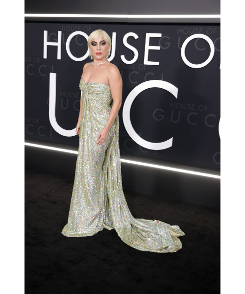 Гага на себе носела сребрен фустан на Валентино без прерамки со блескав дијамантски накит, а гламурозната шминка која вклучуваше „smokey eyes“ и богато нацртан ајлајнер придонесе за целокупниот изглед кој потсетува на стариот Холивуд.