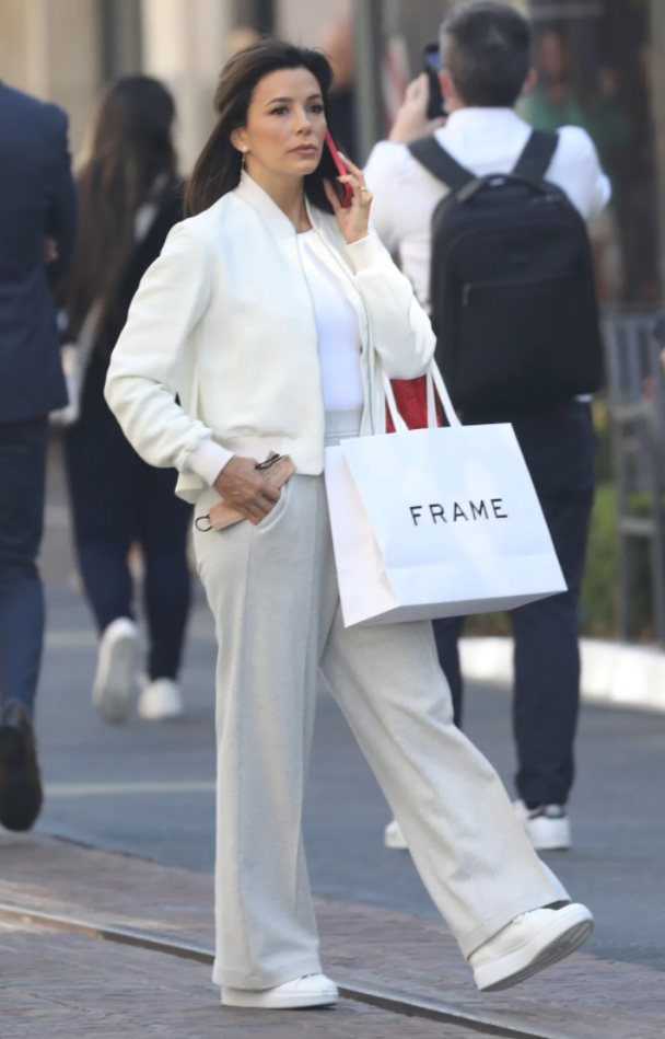Аутфитот што ја освежува секоја гардероба Ева Лонгорија е составен од бела јакна до половината под која носела снежно бела маичка. Спортските крем панталони на линијата одлично го надополнија стајлингот кој зрачи со спортска елеганција.
