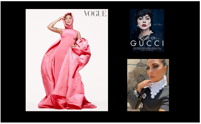 По улогата во филмот „Ѕвездата е родена“, американската музичка ѕвезда конечно ќе се појави на филмското платно на крајот на месецот во филмот „Куќата на Гучи“ во режија на Ридли Скот. А по тој повод, Лејди Гага во новите изданија на британската и италијанската модна библија, магазинот „Вог“ откри неколку непознати детали во создавањето на улогата на озлогласената Патриша Реџани, сопруга на Маурицио Гучи…