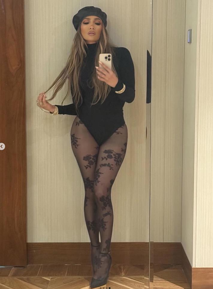 Овој пат, таа се одлучи за комбинација која зрачи со познатиот француски шарм и сексапил. Џеј Ло носеше црно боди со долги ракави, црни чорапи со впечатлив цветен дезен и вртоглаво високи црни потпетици. Изгледот го надополни со кожна беретка, а она што особено го привлече вниманието на фановите беа нејзините извајани бутови, што предизвика вриење на социјалните мрежи.
