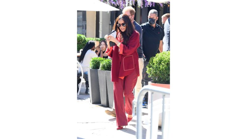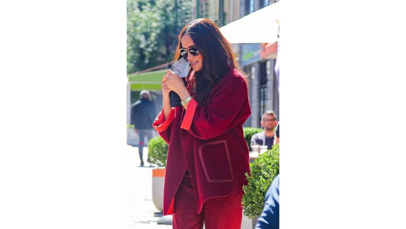 Со својот монохроматски изглед, во црвена боја од глава до пети, таа ни покажа како се носи оваа живописна боја и во есенските денови. Панталони со рамен крој и обемна јакна – комплет од брендот Лоро Пијана, стилизирана со штикли на Маноло Бланик, исто така црвени.