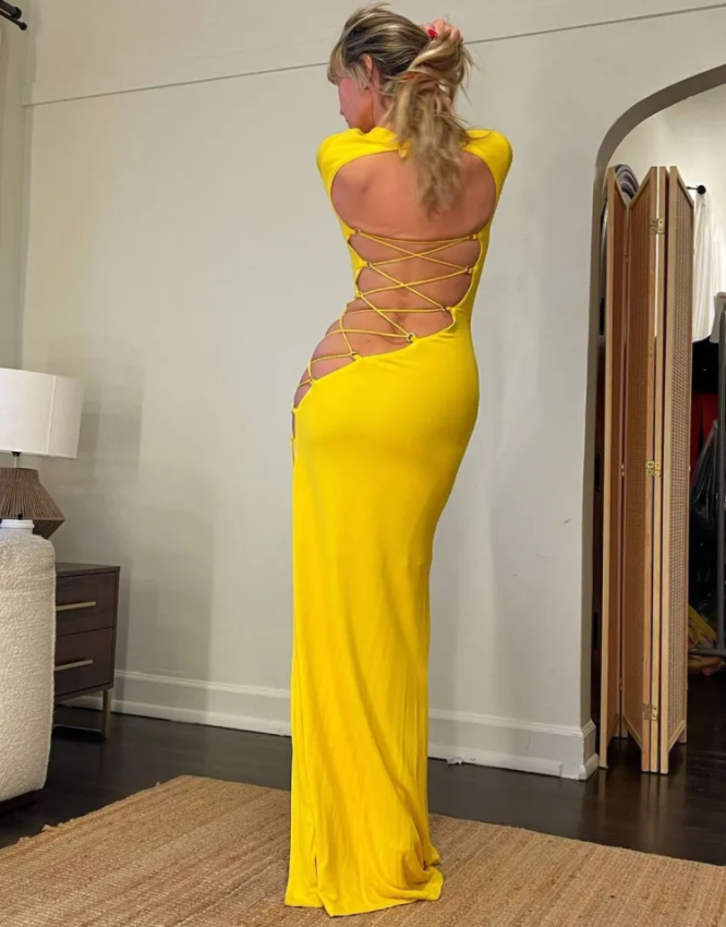 Со провокативен, светло жолт фустан од брендот Dundas, долги ракави и целосно отворен одзади, врзан со тантела која продолжува настрана и завршува настрана, оставајќи го во здолништето целосно отворено од едната страна на бутот до подот , германската манекенка успеа на сензуален и елегантен начин да ја извади оваа необична креација.