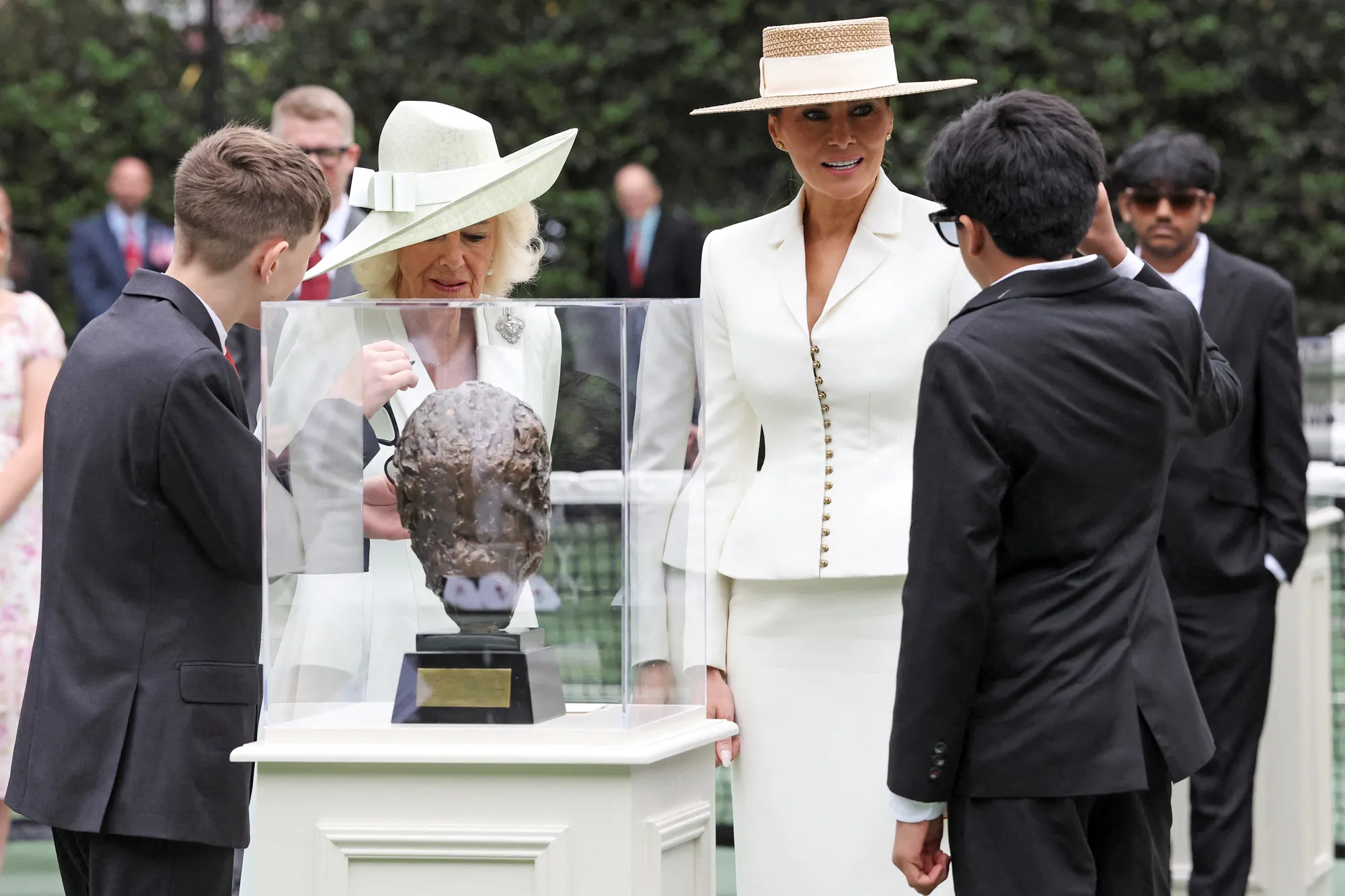 Првата дама Меланија Трамп избра елегантен бел фустан за нејзиниот прием во Белата куќа со кралицата Камила, дизајниран како избалансирана мешавина од протокол, дневна формалност и дипломатски симболизам.