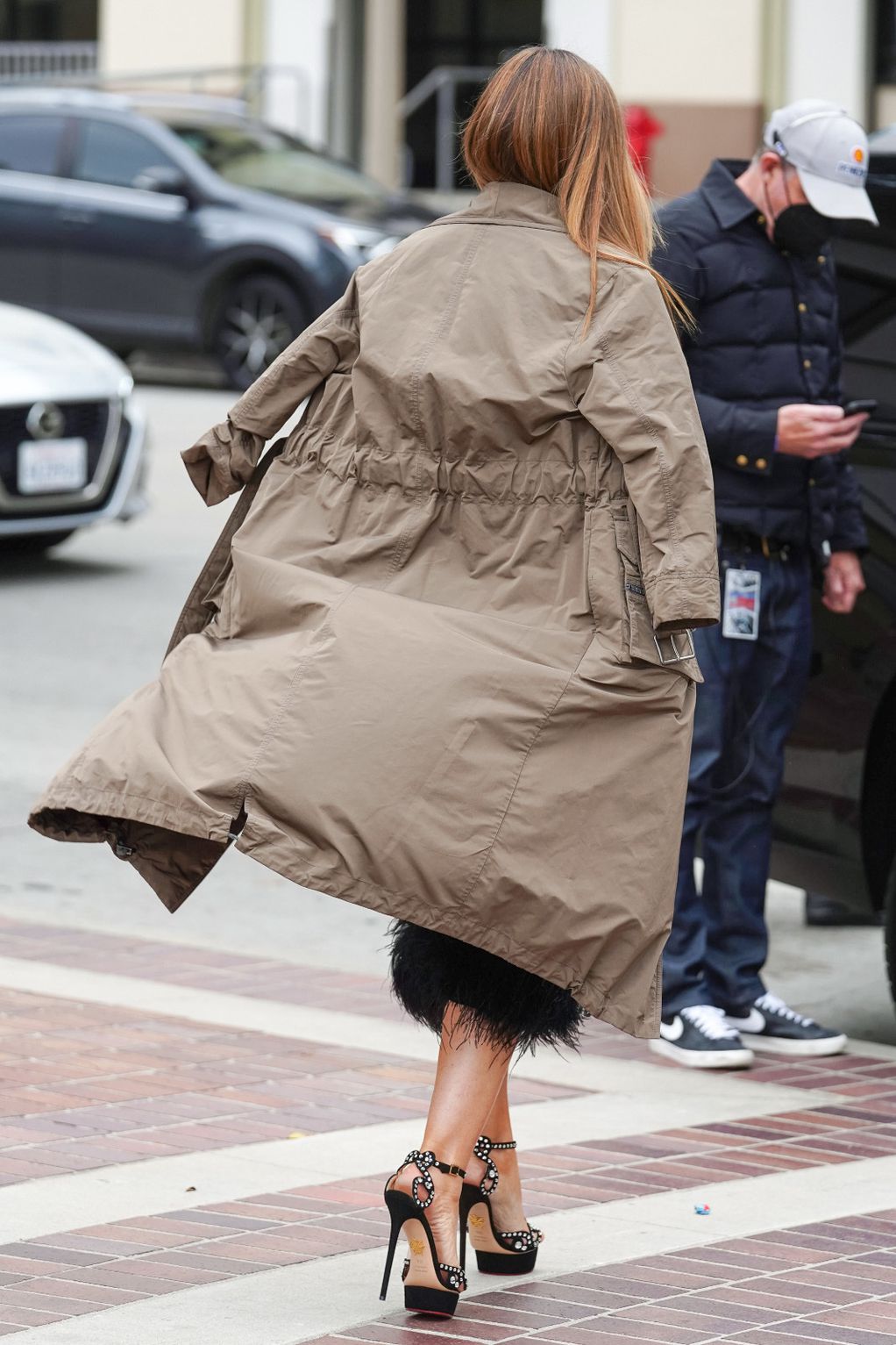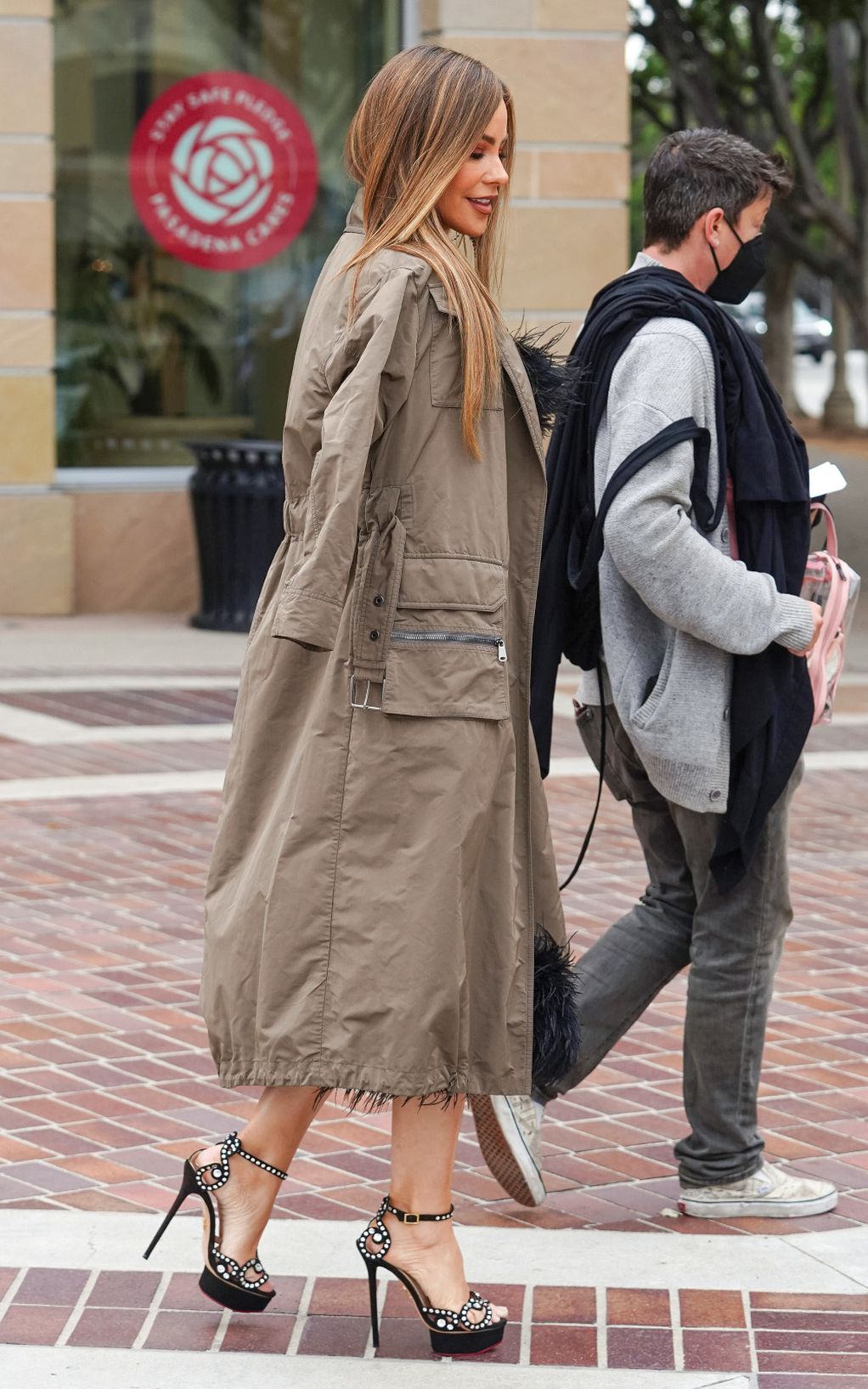 Еднакво гламурозни како фустанот биле и црните сандали кои ги одбрала 49-годишната актерка, модел со вртоглаво висока тенка потпетица и платформа украсена со сребрени штрасови. Целосниот контраст со фустанот и штиклите беше зелено-сив капут во војнички стил со големи џебови и ремен околу половината.